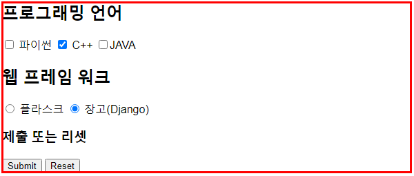 checkbox와 radio 속성으로 버튼을 만들었으며 웹 프레임 워크 메뉴에서는 <label> 태그를 이용했습니다. 체크박스는 사각형 박스를 정확히 클릭해야 되지만 <label> 태그로 지정된 라이오 버튼은 플라스크 또는 장고 텍스트를 클릭하여도 입력이 가능한 것을 알 수 있습니다. 대부분의 웹서비스 폼은 라벨로 묶어 처리하고 있습니다.