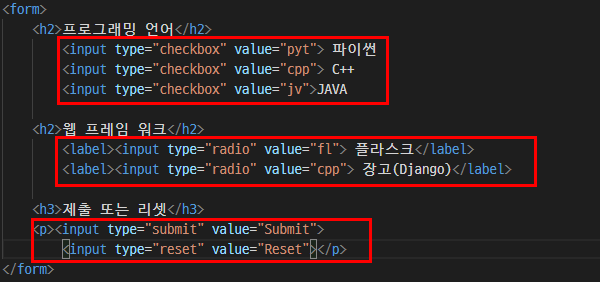 맨 마지막 submit 속성은 서버로 전달, reset 속성은 기존 입력된 사항은 지우고 다시 입력할 수 있도록 합니다.