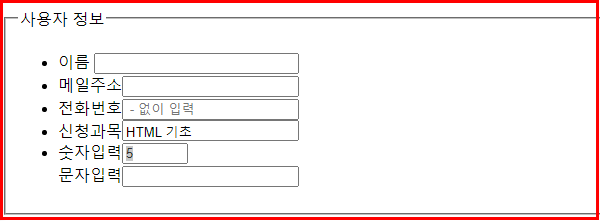 min, max, step 속성이 숫자입력에 적용된다면 size, minlength, maxlength 속성은 텍스트 입력에 적용됩니다. size는 길이, minlength는 최소 입력 제한 그리고 maxlength는 최대 입력 제한을 할 수 있습니다.