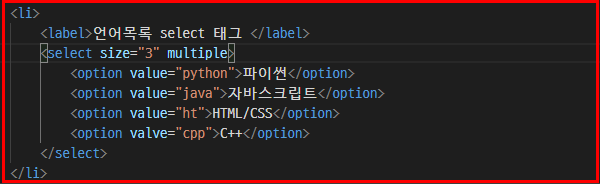 <select> 태그는 size, multiple 속성을 사용하여 여러 개의 항목을 지정할 수 있도록 합니다. size 속성은 화면에 표시할 드롭다운 메뉴 개수를 지정하며, multiple 속성은 Ctrl 키를 이용하여 항목을 여러 개 지정할 수 있도록 합니다. (ctrl + 여러 개의 항목 지정)