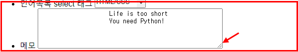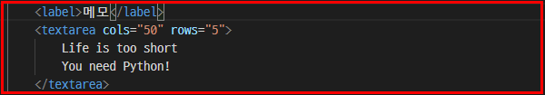 마지막으로 여러 줄을 입력 가능하게 하는 <textarea> 태그에 대해 살펴봅니다. name 속성은 다른 요소와 구분하기 위해 텍스트 영역 이름을 의미하며 cols 속성은 가로(문자 수), rows는 세로의 크기(줄 수)를 의미합니다.