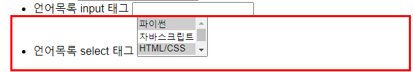 이제 해당 필드를 클릭하면 데이터 목록이 표시됩니다. 만약 마우스 클릭이 아닌 키보드로 p를 입력하면 Python, J를 입력하면 Javascript, H를 입력하면 HTML/CSS가 자동 입력됩니다. 이렇게 <input> 태그로 입력할 수도 있으나 <select> 태그를 사용하면 좀 더 다양한 입력 방식을 적용할 수 있습니다.