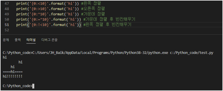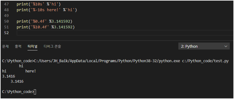 위의 코드 결괏값을 보고 포맷 코드 %%, %0.2f의 의미를 이해한다면, 포맷 코드와 숫자를 함께 사용한 문자열 정열도 쉽게 이해할 수 있습니다.