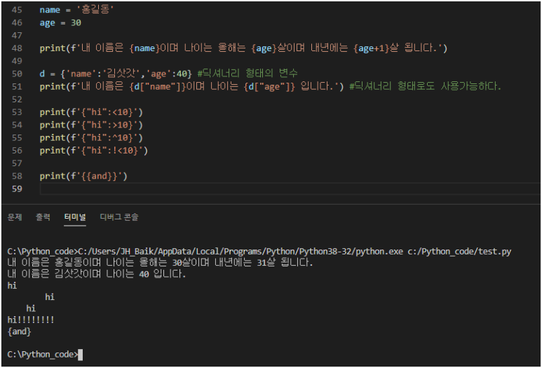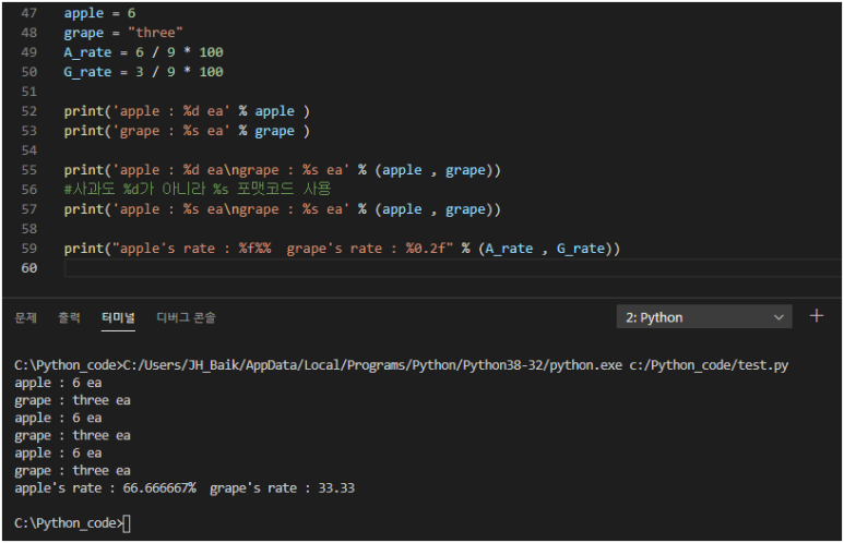 출력 결괏값이 같아 보이지만 맨 마지막 포맷 코드를 %d에서 %s로 넣었는데도 에러가 없는 이유는 숫자형 변수도 문자열 변수로 변환하여 넣기 때문입니다.