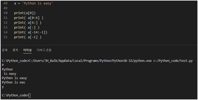 문자열 인덱싱과 슬라이싱을 ‘Python is easy’란 문자열로 알아보겠습니다.