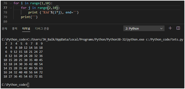다중 for 문과 range()를 이용하여 구구단 결괏값을 만들어 보겠습니다.