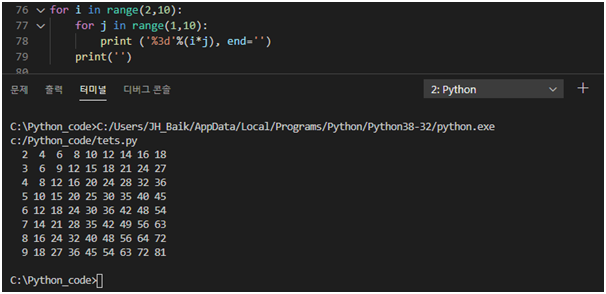 다중 for 문과 range()를 이용하여 구구단 결괏값을 만들어 보겠습니다.