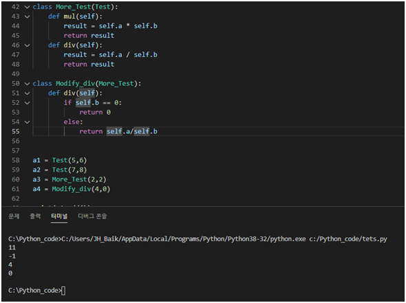 More_Test 클래스가 Test 클래스를 상속받아 a3.mul()과 a4.div()가 문제없이 실행되는 것을 확인할 수 있습니다. 기존 클래스를 수정하지 않고 상속으로 처리하는 이유는 기존 클래스가 수정할 수 없는 라이브러리 형태로 제공되거나, 수정이 허용되지 않을 경우가 발생하기 때문입니다. 상속받은 클래스의 메서드를 동일한 이름으로 다시 만드는 것을 메서드 오버라이딩(overriding)이라 합니다. More_Test에서 상속받은 div() 메서드를 동일한 이름을 사용하여 오버라이딩 해 봅니다.
