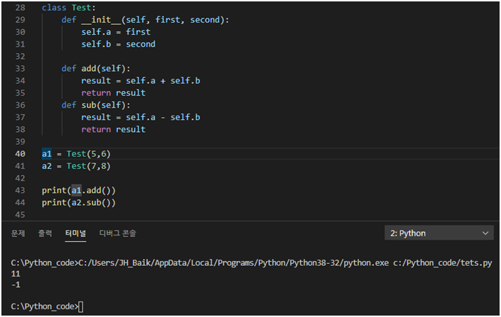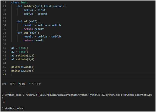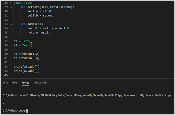 Test 클래스 객체를 만들고, 메서드(=클래스 내 함수)를 설정합니다. setdata(self, first, second)에서 self는 뒷줄에 나올 a1, a2를 가리키며 first는 self.a에 second는 self.b에 입력하게 됩니다. add(self) 메서드는 기존과 같이 함수를 만드는 방법과 동일하지만 self는 나중 a1, a2를 가리키는 변수이기에 필히 넣어줘야 합니다.