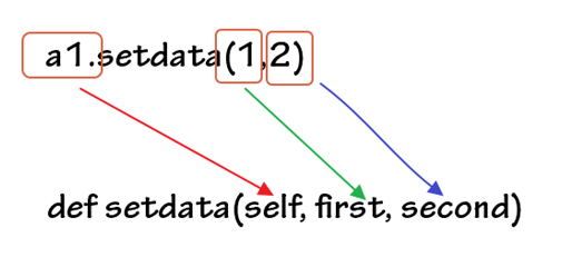 a1.setdata(1,2)를 통해 인수를 매개변수로 넣을 수 있지만 생성자(Constructor)를 통해 구현할 수 있습니다. __init__를 사용하면 이 메서드는 생성자가 됩니다. setdata() 없이 클래스를 호출할 때 인수를 매개변수로 입력했습니다.