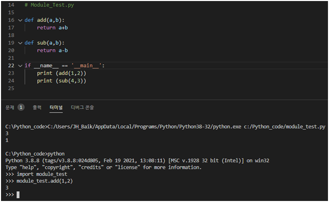 module_test.py 에 print문을 추가 하여 실행하고 결과를 확인 합니다. 그리고 Python을 실행 후 프롬프트에서 import module_test 해 보면 의도치 않게 print문까지 실행되어 3, 1을 출력합니다. 함수만 불러오고 싶은데 print까지 실행되면 안되겠죠?