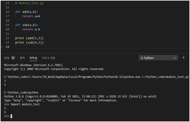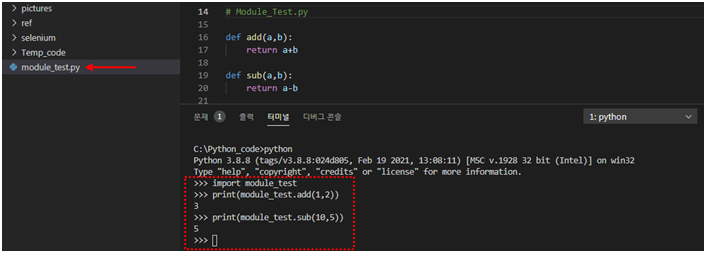 import 명령어로 Module_Test.py에서 작성된 함수 add, sub를 호출하여 사용했습니다.
