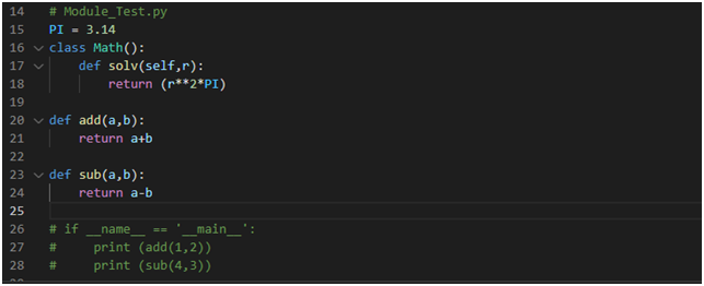 함수뿐만 아니라 변수 또는 클래스도 import 할 수 있습니다. 우선 PI변수를 지정하고 원넓이를 계산하는 Math()클래스와 solv() 메서드(클래서 내 함수)를 작성하여 저장합니다.