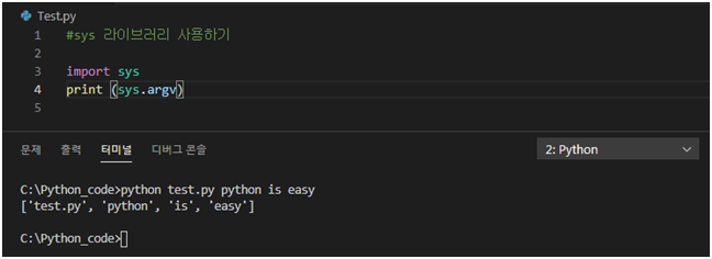 python 실행 후 모든 문자열들이 공백을 기준으로 나뉘어 sys.argv 리스트의 요소가 되는 것을 알 수 있습니다.