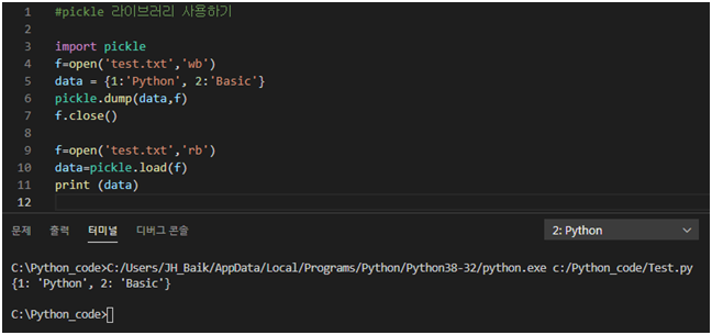 dump 함수를 사용하여 딕셔너리 형태의 자료를 test.txt에 기록하고, load 함수를 통해 불러와 출력하는 것을 볼 수 있습니다. 딕셔너리 객체 외 어떤 자료형이든 저장하고 불러올 수 있습니다.
