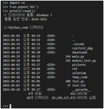 시스템 명령어 실행한 결과를 읽기 형태의 파일 객체로 리턴