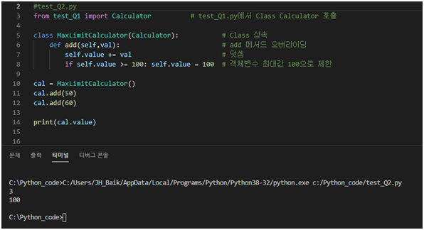 Q2. 객체 변수 value가 100 이상 값을 가질 수 없도록 제한하는 MaxLimitCalculator 클래스를 만들어 봅니다. 단, Q1의 Calculator를 상속해서 만들어야 합니다.