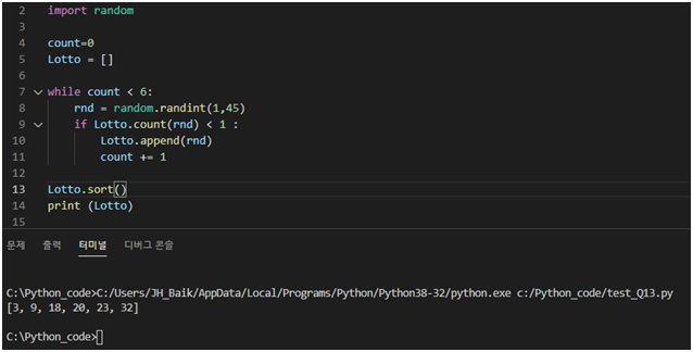 Q13. random 모듈로 로또번호 추출해 봅니다. 중복 숫자는 제외해야 합니다.