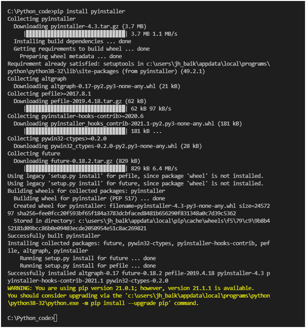 파이썬 실행파일을 만들기 위해 pyinstaller 모듈을 pip로 간단하게 설치합니다.