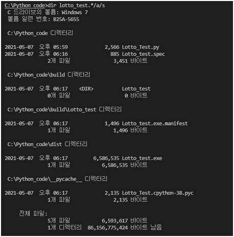 lotto_test.exe뿐만 아니라 여러 개의 파일들이 생성되었음을 확인하고 lotto_test.exe의 디렉터리 위치도 확인합니다. (dir lotto_test.*/a/s는 파일명이 lotto_test로 시작하는 모든 리스트를 하위 디렉터리까지 포함하여 화면에 뿌려줍니다.) c:\Python_code\dist로 이동하여 lotto_test_.exe를 실행합니다.