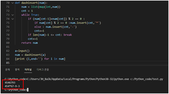 Q13. Dashinsert 함수는 숫자로 구성된 문자열을 입력받은 뒤 홀수가 연속이면 하이픈( - ), 짝수가 연속이면 아스테 리크( * )를 추가합니다. Dashinsert 함수를 작성해 봅니다.