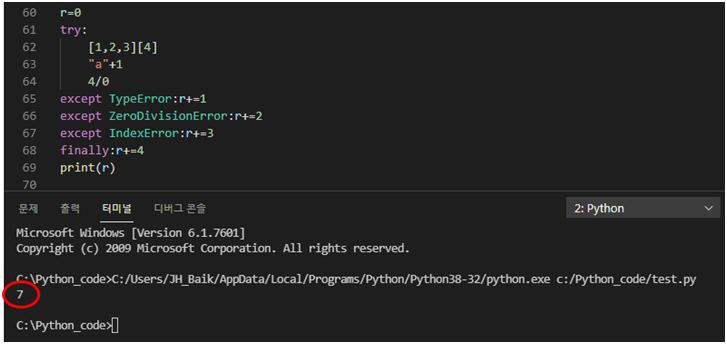 try 수행문에서 어떤 에러가 발생하는냐에 따라 r 값이 바뀌게 됩니다. 제 예상대로 7이 출력됩니다.