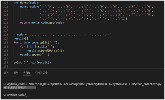 아래와 같은 모스 신호를 모스부호 규칙표를 참고삼아 해석하는 함수를 작성해 봅니다. 글자와 글자 사이는 공백 1개, 문장과 문장 사이는 공백 2개로 구분합니다.